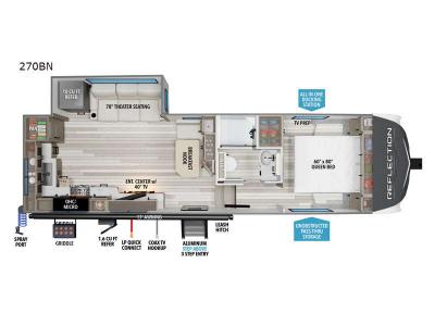 The Reflection 270BN features a rear kitchen design with great countertop space, high-quality appliances, and smart storage for meal prep at the campsite or on the road. The central living area includes theatre seating, a well-situated entertainment centre, and large windows that create a bright, open space to relax after a day of adventure.