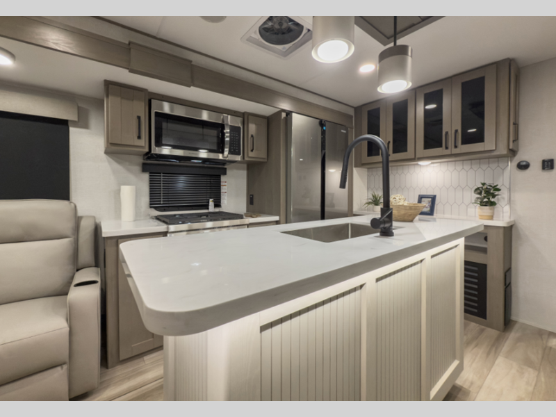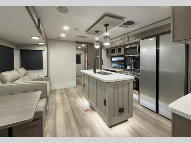 Reflection is built with the Arctic 4-Season Protection package which provides a 35K BTU high-capacity furnace, double insulated roof and front cap, a heated and underbelly with circulating heat, and 12V heat pads on the holding tanks to mention a few features that allow you to travel during any climate. The interior offers residential cabinetry, a deep-seated stainless-steel kitchen sink in the gourmet kitchen, a spacious shower with a glass door, and ductless flooring in the living area to name a few comforts.