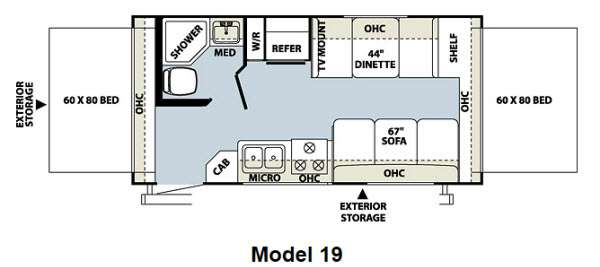 Fully Laminated Aluminum Frame (Floor, Sidewall, & Roof) Insulation Factors R-7 Side Wall, R-12 Floor and R-14 Ceiling Radius Roofs Vinyl / Rubber Composite Roofing Membrane Laminated Lamilux 1000 Fiberglass Sidewalls Electric Slide-Out (all slide out models) Industrial Lockable Bed Latches Easy Step Assist to Access Bed Latches Bed Cable System (No Poles) Entrance / Screen Door Grab Handle Next to Entrance Door Radius Corner Windows and Doors Large Dinette Picture Window Outside Grill Prep Outside Shower Outside Antifreeze Stations in Storage Compartments Two-20 lb. Gas Bottles Molded Bottle Cover Surface Coated Steel I-Beam Frame 96" Front Storage Deck (19L, 21SSL Only) Stabilizer Jacks Torsion Axle, Rubber-Ryde Suspension Easy Lube Axle Automotive Radial Tires 14" Tires with Double Step