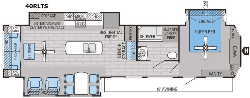 As you enter the trailer, to the left there is a slide with a free-standing table with chairs, and two lounge chairs or choose theater seating instead. Along the rear wall there is a hide-a-bed sofa, end tables, and an ottoman, plus a ceiling fan in between the sofa and kitchen island.