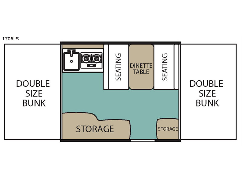 Camp a whole lot simpler in this LS Series camping trailer 1706LS by Viking RV. Step inside and slide out the front and rear double size tent end beds for comfortable sleeping. Just inside the front door you will find abundant storage with cabinets on both sides of the door. Straight inside there is a dinette table. It can also be folded down at night to create another sleeping space. There is also storage below the bench seats for games, camping equipment, and more. You will enjoy the convenience of being able to cook light meals or perk your morning coffee on the two burner range. The kitchen sink makes cleaning up quick and easy too. Across from the sink there is plenty of counter space and storage for all of your things, plus more!